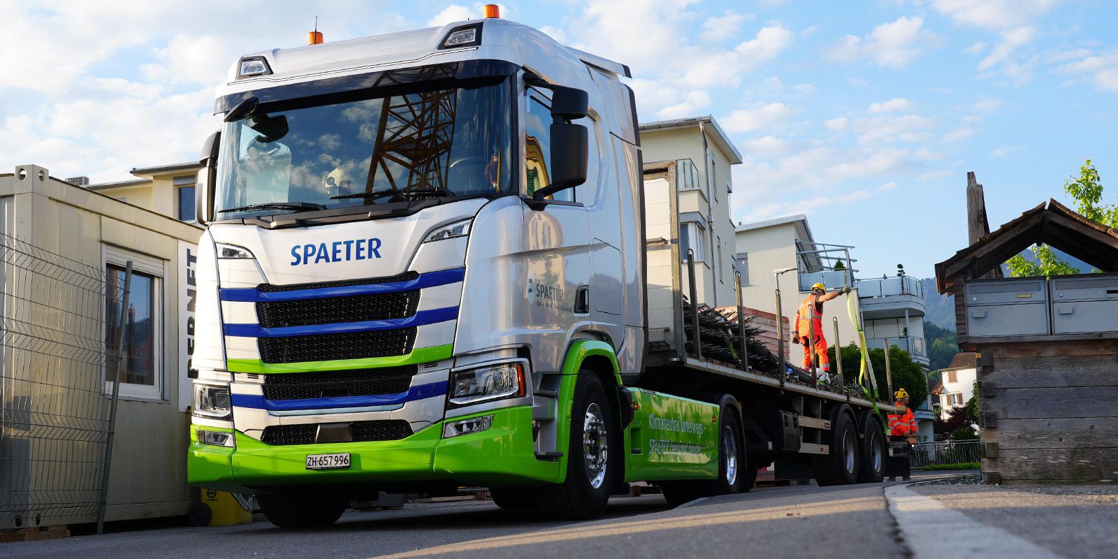 Dal punto di vista estetico, il nostro nuovo camion elettrico si distingue chiaramente dal resto della flotta: elementi di design verdi sulla griglia del radiatore, sul paraurti e sul passaruota, nonché lo slogan «Klimaneutral unterwegs – SPAETER beginnt heute» (Viaggiare a impatto zero sul clima – SPAETER inizia oggi) rendono il veicolo davvero accattivante.